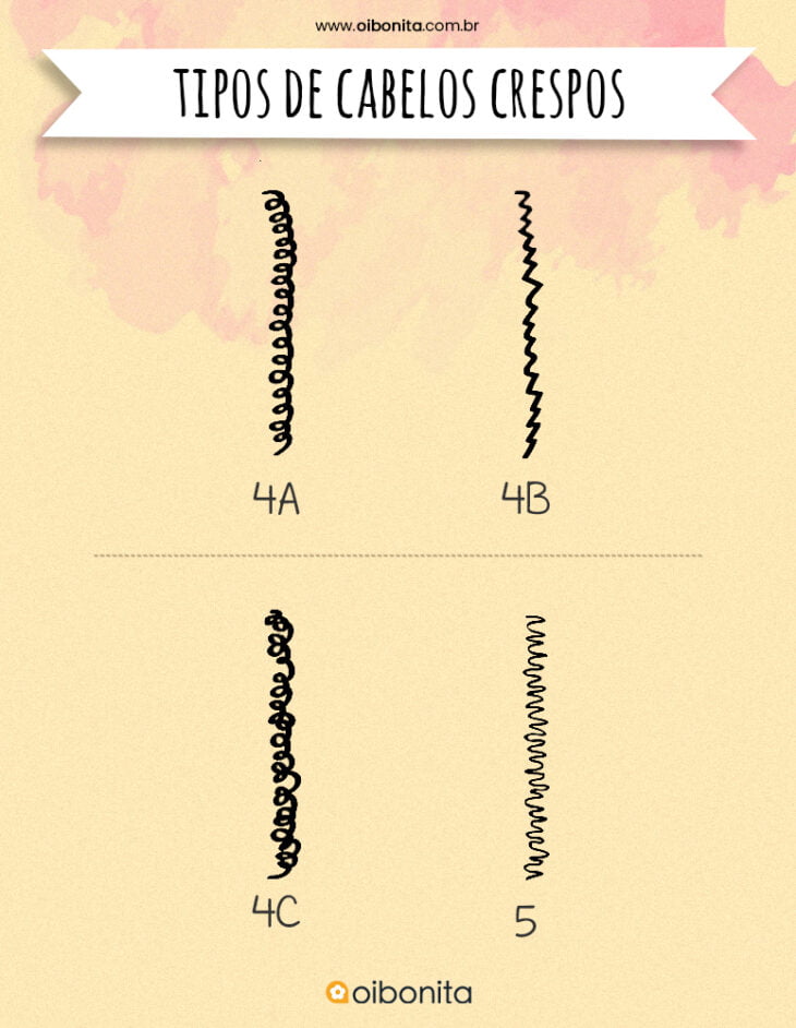 Bem como os formatos de rosto e corpo, também há uma diversidade enorme de tipos de fios de cabelo. Para entender melhor tudo isso, há a tabela de curvatura de fios, que denomina os cabelos lisos como tipo 1, os ondulados como tipo 2, os cacheados como tipo 3 e os crespos como tipo 4. Mas não para por aí, pois dentro dessas quatro categorias, há subdivisões em letras. O tipo 4 (os fios crespos), por exemplo, é subdivido entre os tipos 4A, 4B e 4C. Entenda cada um deles: