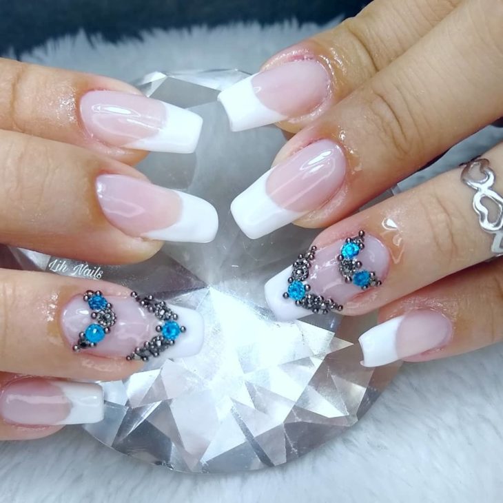 Aqui você vai ver duas decorações: a primeira, uma tradicional francesinha com aplicação de película rendada e pedrinhas de strass. A outra decoração é feita com francesinha na diagonal e finalizada com fitilhos prateados.